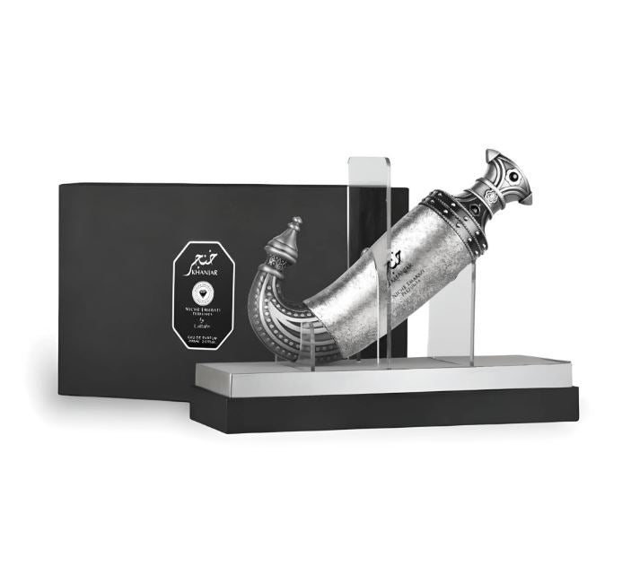 Khanjar, cuyo nombre significa “dagal”, es una fragancia nacida en el corazón del desierto nocturno, donde el fuego ilumina la arena y la luna plateada vela en silencio. Es un perfume que encarna honor, linaje y poder ancestral: una esencia solemne, ardiente y profundamente enigmática.